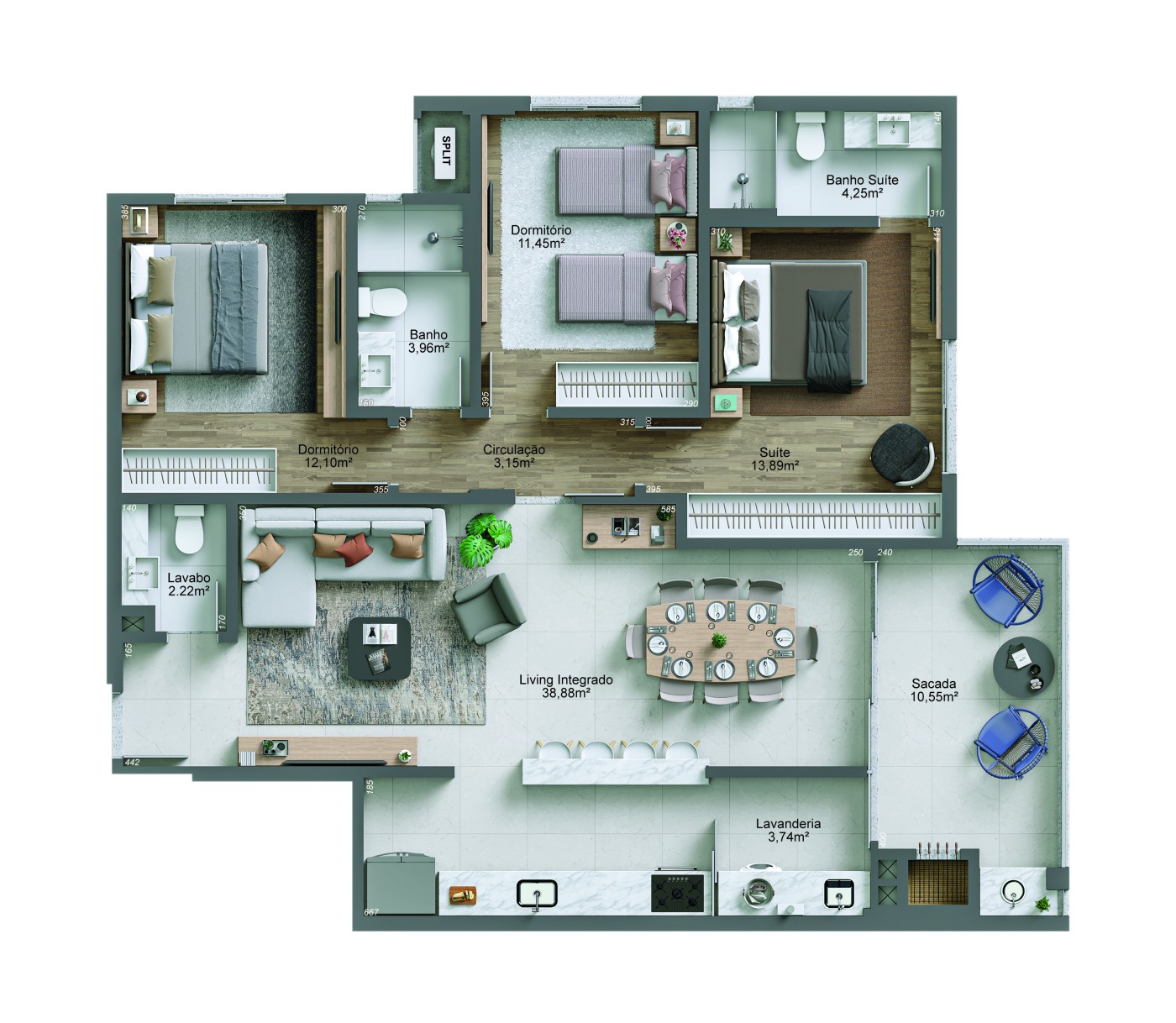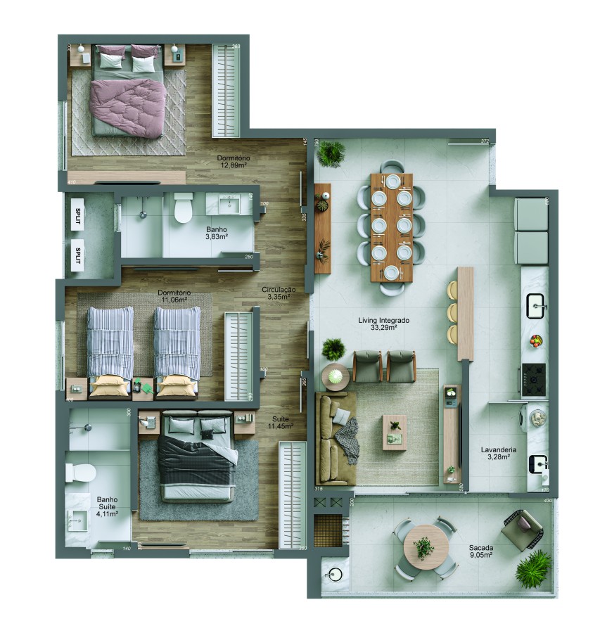 Apartamentos com 3 dormitórios (1 suíte), plantas de 107m a 126m de área privativa, com ambientes amplos, integrados e excelente padrão de acabamento.